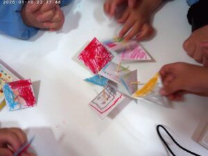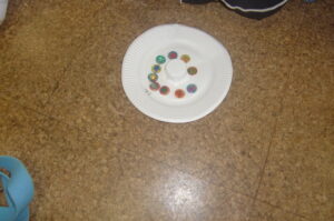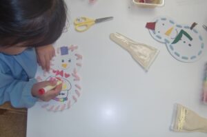 <コマ作り> 年中少組は厚紙にマッチ棒を刺したコマ、つぼみ組は紙皿の真ん中にペットボトルのふたを付けたコマを作りました。指先を使って回すのは少し難しいようでしたが遊んでいくうちに回せるようになった子もいました。