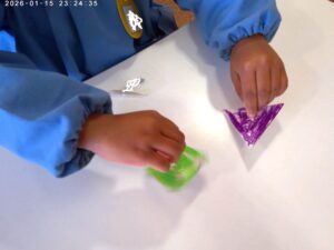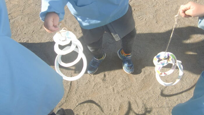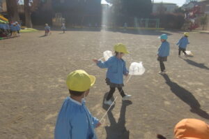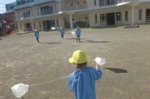 <凧作り> 年中組はヘビだこを作りました。ひもを持って揺らすと上下に動いたり走るとくるくるまわる凧です。年少組はレジ袋の凧です。少し風が吹くと袋の中に風が集まって引っ張られる感じがおもしろいようです。