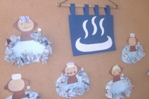ばら組の廊下の装飾はおさるの温泉、ゆり組は雪だるまを作りました。