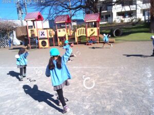 年中組の体操は中あてと縄跳びをしました。 縄跳びは個人差もありますが頑張って練習中です。年少組は跳ぶ前の段階で縄に慣れる ような遊びをしました。