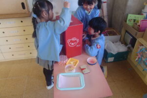 年長中組で郵便屋さんごっこをしています。郵便局は年長組にあります。ハガキ、切手がもらえハガキには送りたい友達のクラスと名前、郵便番号(好きな数字)と自分のクラス、名前を書き、裏は絵でも字でもOK、できたらポストに入れます。