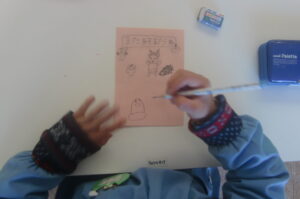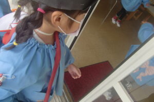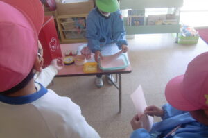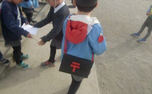 お昼過ぎ頃に今日の郵便屋さんが集まったハガキにハンコを押して配達。幼稚園のお友達、先生がどこにいても探して手渡します。SNSやメールの世の中で ”手紙” のやり取りの楽しさを感じられるといいですね。
