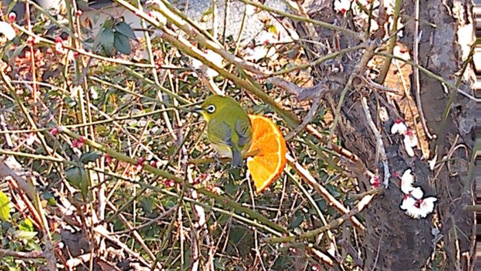 正門のうめの木と裏庭にメジロが来ます。メジロはうめや桜など冬から春に咲く花の蜜の所に来るそうです。
