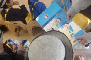 ゆり組のお話の会はりゅうのすけ君とりんちゃんのお母さんに絵本を読んでもらいました。どちらの絵本もおもしろい場面では大笑いしながら聞き入ってました。