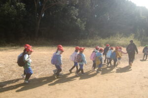 いつものように幼稚園に「行ってきます!」をして出発しました。大町神社、不二グランドを通って到着。友だちと話したり回りを見ながら歩くことも楽しめるようになりました。