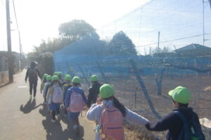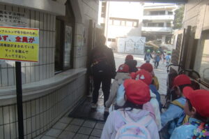 いつものように幼稚園に「行ってきます!」をして出発しました。大町神社、不二グランドを通って到着。友だちと話したり回りを見ながら歩くことも楽しめるようになりました。