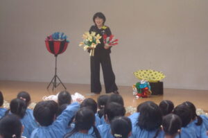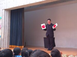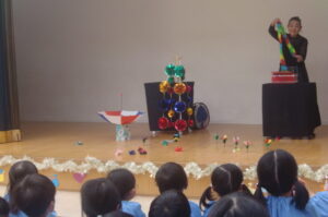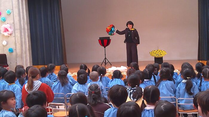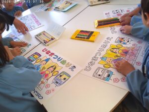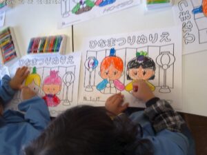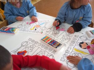 2026年2月20日 いべんと マジックショー 2月10日(火)保護者の会主催、松戸奇術会によるマジックショーがありました。 小さな箱の中からたくさんのカラフルなお花やハンカチなど次々に出てきて子どもたちから大歓声! カードや傘、大きな旗が出てくるマジックも見せていただきました。不思議だね~ 北総線松飛台駅に頼まれてお雛様のぬりえをしました。3月3日まで飾られています。