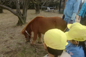 楽しみにしていたこの日のミニ鉄道はディーゼルカーでした。お弁当もキリンの広場で食べました。ポニーもお昼の時間!
