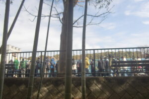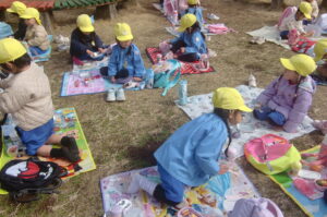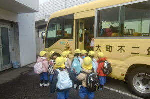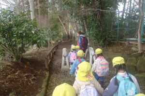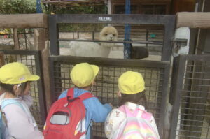 幼稚園バスで出発!大通りからうさぎの道を歩き受付へ、フライングゲージとエミューの横を歩いてキリンの広場に行きました。