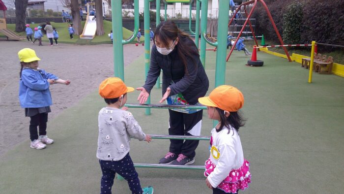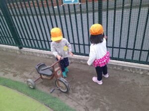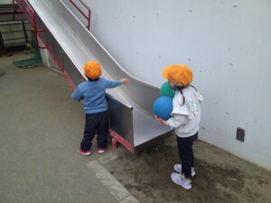 6日(金)は天気が良かったので外でたくさん遊びました。友達を誘ってボールで一緒に遊んだり、それを見て「私も!」とボールを取りに行ったり…。友達を意識して遊んだり、関わりがとても増えましたね。