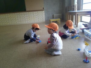 19日(木)は小雨が降っていたので、室内で遊びました。ブロックも上手に使えるようになり、集中して思い思いの物を作れるようになりました。