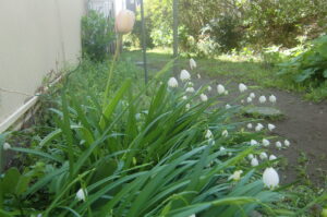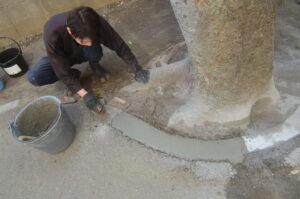 倒木がないように志村農園さんに園庭の桜やふじの木その他を見てもらいました。三輪車置き場近くのけやきの木の根っこが張ってきて回りのコンクリートが割れていたので直してもらいました。作業をしているのは卒園生です。ボランティアで直して頂きました。