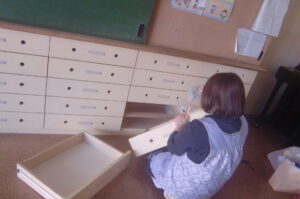幼稚園の床全部にワックスもかけました。職員みんなで子どもたちの道具箱、保育室の窓などの掃除、裏庭の草取りなどして新学期を迎えます。
