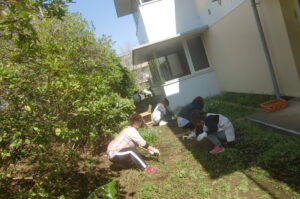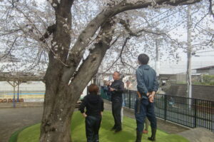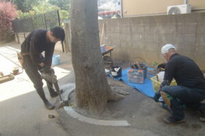 倒木がないように志村農園さんに園庭の桜やふじの木その他を見てもらいました。三輪車置き場近くのけやきの木の根っこが張ってきて回りのコンクリートが割れていたので直してもらいました。作業をしているのは卒園生です。ボランティアで直して頂きました。