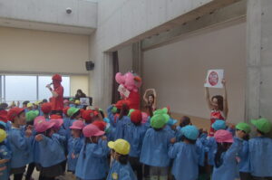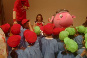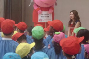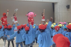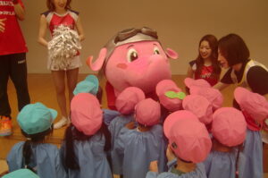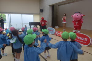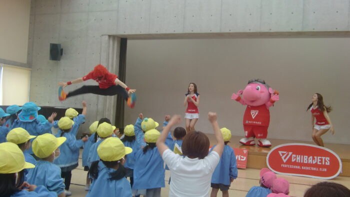 2026年4月24日 いべんと 千葉ジェッツジャンボ君キャラバン ジャンボ君が遊びに来てくれました。地域の子どもたちへの支援を目的とした活動に参加させていただきました。 マスクドオッチーとスタージェッツのお姉さんにチアダンスとゴージェッツ!の掛け声も教えてもらいました。 「ジャンボ君はキリンです??」・・などの〇×クイズも楽しかったね。 最後にかわいいジャンボ君やジャンプがかっこいいマスクドオッチー、きれいなお姉さんにありがとうを言ってタッチしてお別れしました。